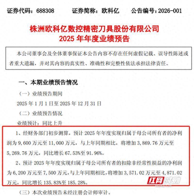 红网技艺新闻1月19日讯(记者 肖娟)1月18日,株洲欧科亿数控精密刀具股份有限公司(以下简称“欧科亿”)发布2025年年度功绩预报,多项中枢财务办法瞻望大幅增长。
