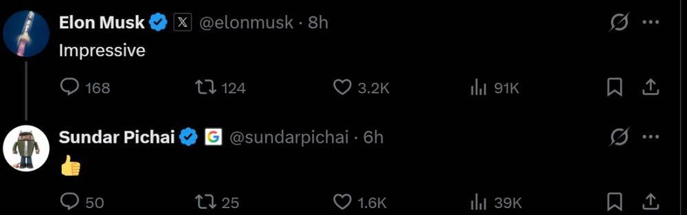 看成谷歌的敌手之一,xAI的独创东谈主马斯克都不由得在这条贴文里留住了一句“令东谈主印象长远”,皮查伊则回应给他一个“大拇指”神气。