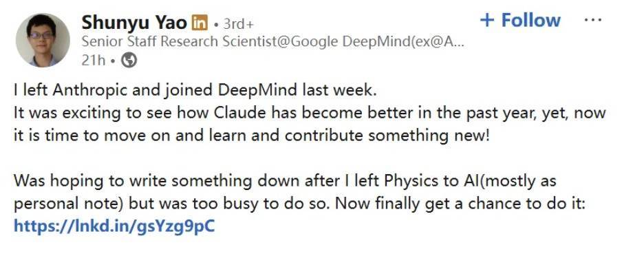 但故事莫得在辞职中已矣。离开Anthropic仅10天后,姚顺宇就加入了Google DeepMind,担任高等盘算推算科学家(Senior Staff Research Scientist),且径直进入中枢Gemini团队。