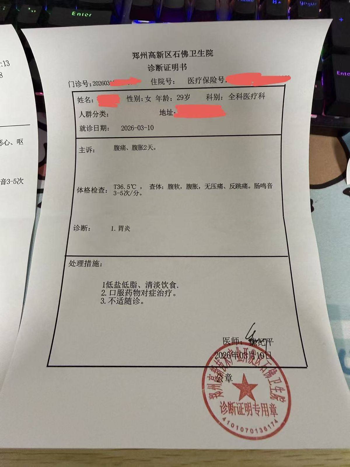 杨先生称,事发后,同他沿路就餐的又名女性一又友肚子不闲适,并伴有吐逆倨傲,随后前去病院查验,会诊评释单涌现因腹痛、腹胀导致胃炎。进程两天休养,该女士情况已好转。杨先生先容,今日伴计容许更换的菜品莫得上,商家也莫得进行任何退款或抵偿处理。