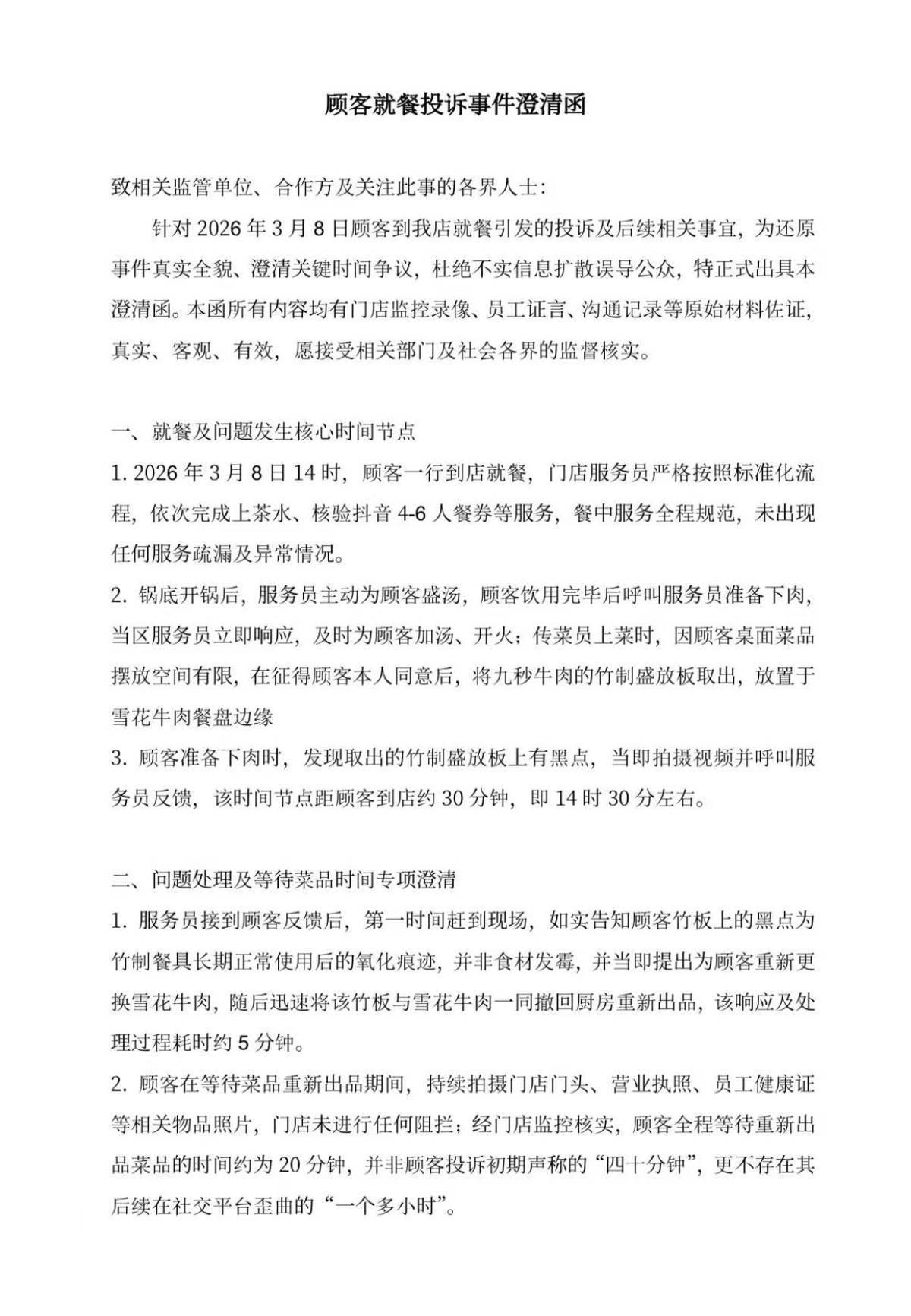 对此,该暖锅店的管制方-郑州淼福企业管制有限公司发布走漏函。施行涌现,3月8日14时,杨先生一溜东说念主来到暖锅店就餐,14时30分,主顾准备下肉时发现竹制盛放板上有黑点,职业员巡视并呈报主顾,黑点是竹制餐具永恒泛泛使用后的氧化陈迹,并非食材发霉,漠视从头更换菜品,并撤掉竹板和餐品。14时55分,门店从头上都菜品。