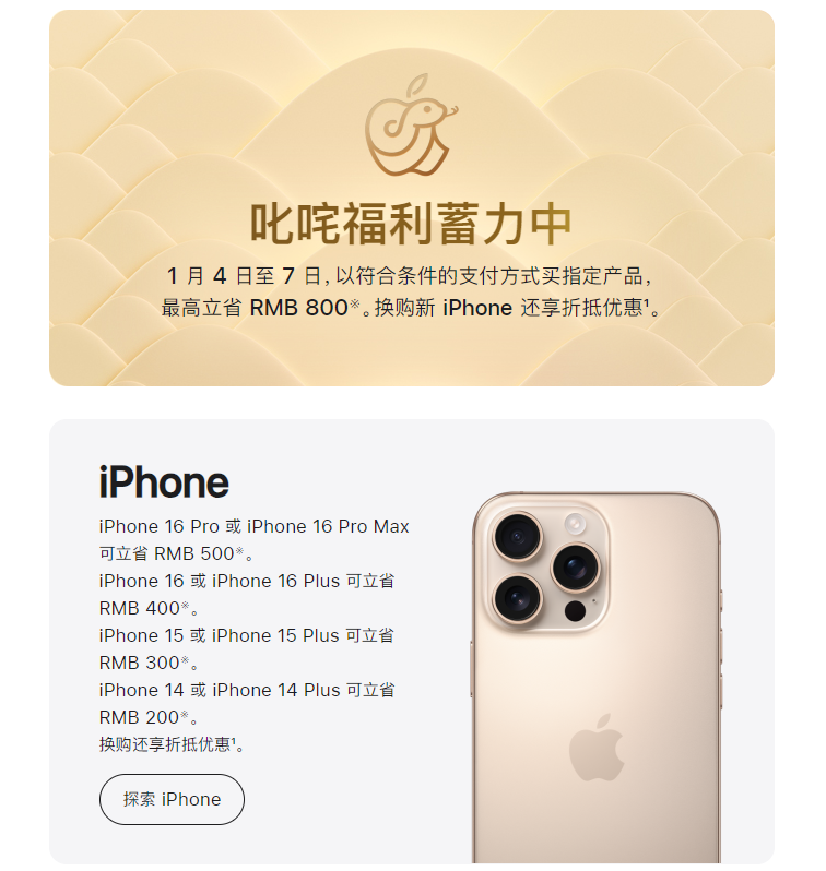 1月2日,苹果中国官网通知,但凡1月4日至7日,以适应条款的支付形式购买指假寓品的用户,最高可立省800元东谈主民币。每位用户每个居品类别限购2件,换购新iPhone另有折抵优惠。