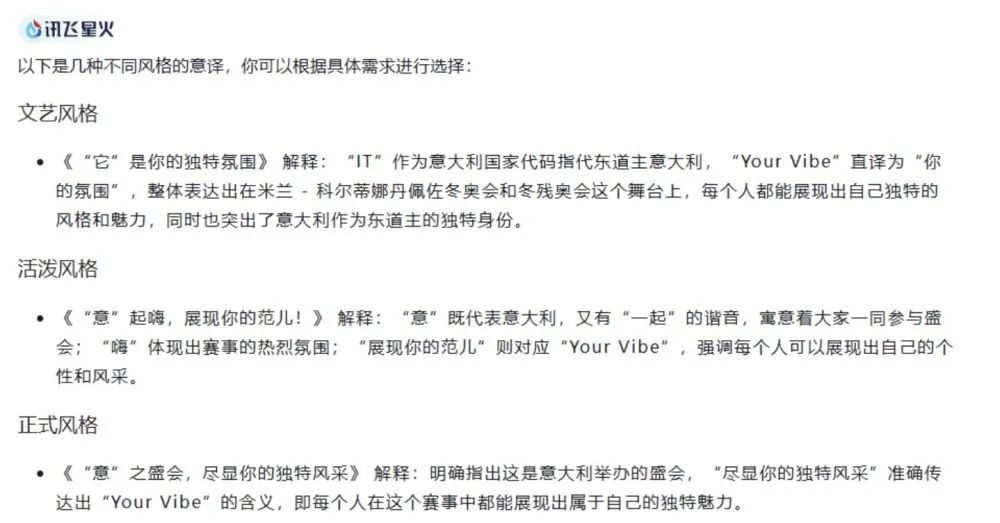 讯飞星火版块:1.“它”是你的独有氛围。2.“意”起嗨,展现你的范儿!3.“意”之嘉会,尽显你的独有风姿。