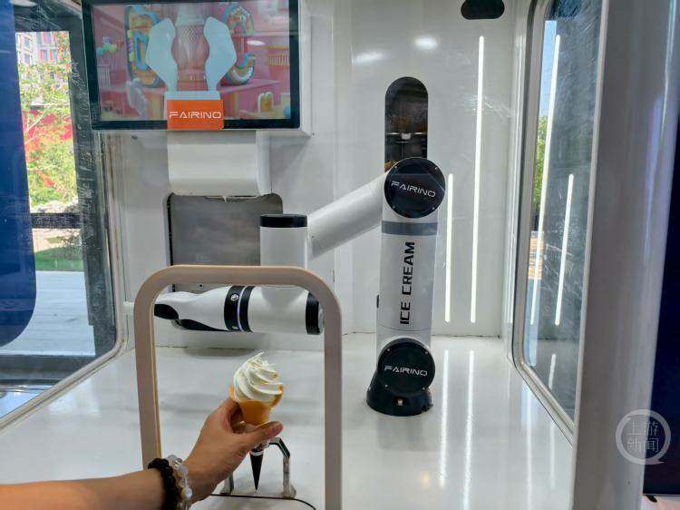 点击制作按键,机械臂自动取出蛋筒,冰淇淋机感应到蛋筒达到位置后会凭证提前设定好的剂量制作冰淇淋,之后机械臂会将冰淇淋送到窗口支架上……全程不到1分钟,一枚香甜冰爽的冰淇淋就制作完成了。9月16日,在苏州东谈主工智能+产业改进大会暨云智算时代生态大会会场外,自动冰淇淋机的亮相诱骗了不少参会者前往体验。这只是是苏州市“东谈主工智能+”大会上的一个小场景。