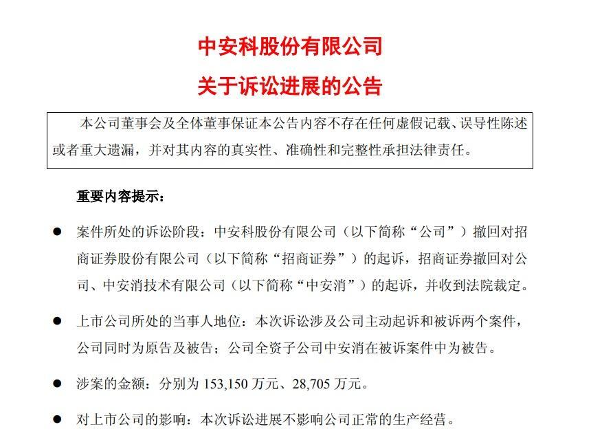 9月23日,中安科泄漏一则对于诉讼证实的公告,触及头部券商招商证券。据悉,中安科与招商证券触及18.19亿元的两告状讼厚爱以两边撤诉告终。