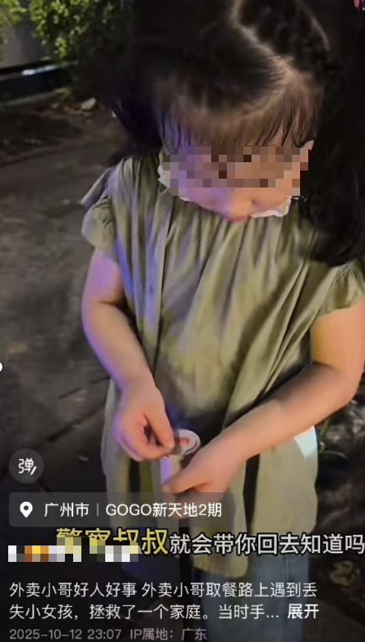 南齐记者了解到,高嘉浩是广州东谈主,跑好意思团外卖如故3年了,他主要默契大学城片区,对这边的东谈主事物齐比拟老练。据他回忆,10月12日18时足下,他在配送外卖时发现一个约莫四五岁的小女孩独自站在路边,预计女孩是与家东谈主走散了。“我看到她一个东谈主站在路边懵懵的,就主动骑车畴昔,一畴昔她就坐窝迎过来扯住我的衣角。”高嘉浩说。