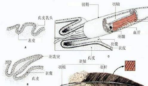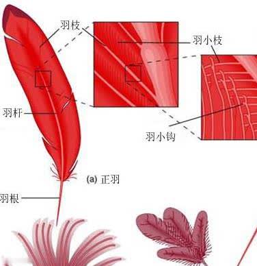扫数羽毛都有交流的结构。第一部分是翮,即与体魄不时的角质部分;第二部分是羽轴,这是白色的、附有羽枝的部分;第三部分是羽枝,从羽轴两侧蔓延成羽瓣。羽瓣与羽轴合称为羽身,再细分为由小羽枝和羽枝组成的档次。